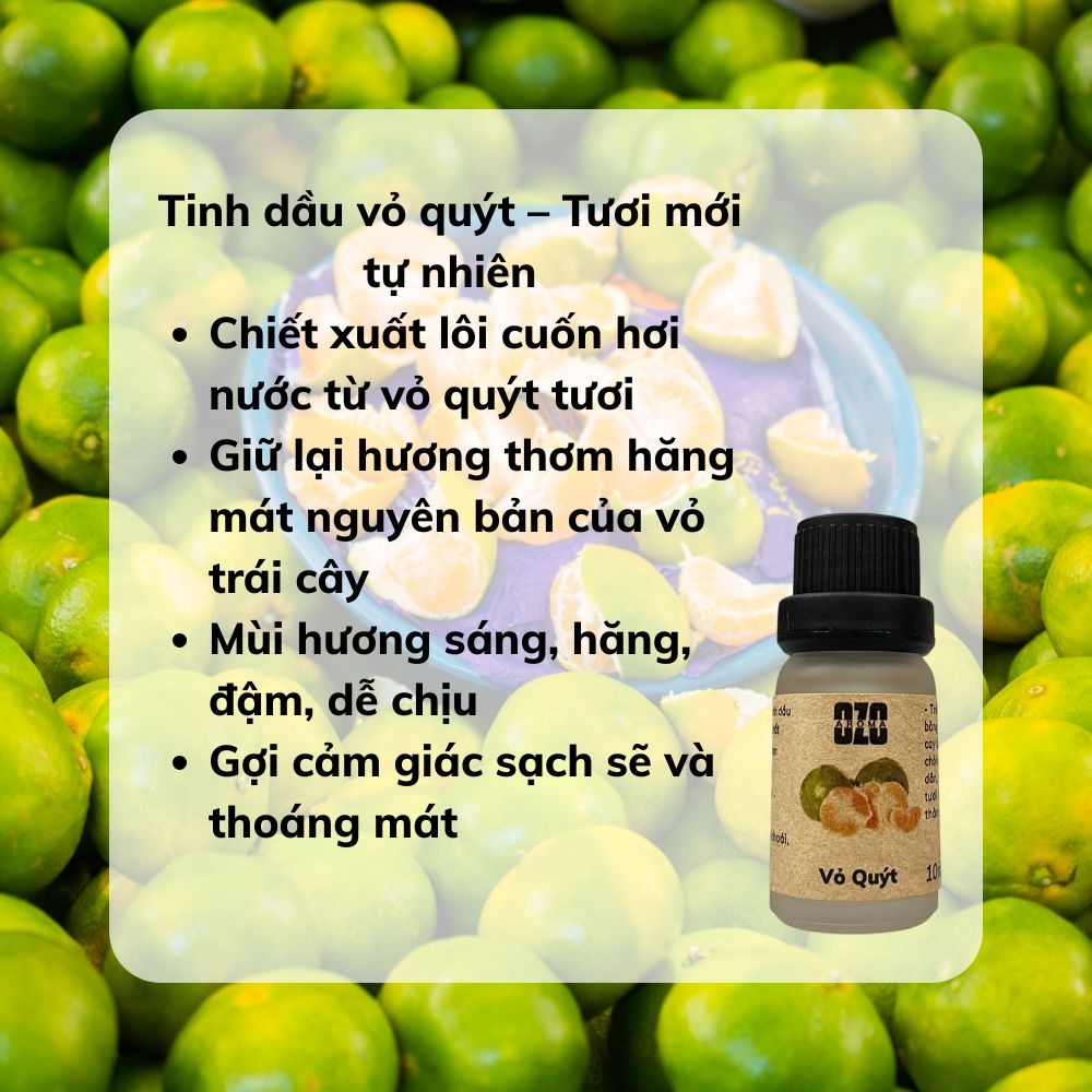 Tinh dầu vỏ quýt được chưng cất hơi nước từ vỏ quýt tươi – mang hương thơm ngọt thanh, dịu nhẹ và tươi sáng đặc trưng. Đây là mùi hương được nhiều người yêu thích vì sự nhẹ nhàng, dễ chịu, phù hợp cho cả không gian làm việc lẫn nghỉ ngơi.